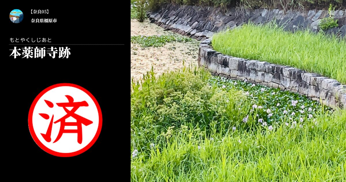 ホテイアオイが咲き誇る紫色の景色を目当てに・本薬師寺跡へ。どこにでもある田舎の風景を通って目的地に到着。看板の指し示す方へ歩いていくと、そこにはさびれた寺跡が。この奥にホテイアオイが咲き誇っているんでしょう。・・・と思いきや、そこにあったのは枯れたハス畑と、どこまでも広がる田園風景。本当ならここら辺に紫のじゅうたんが広がってるはずなんやけどな。どうやら2023年でホテイアオイの植付け事業は中止されたらしい。代わりに、耳成山公園の池に若干咲いているのを見つけました。