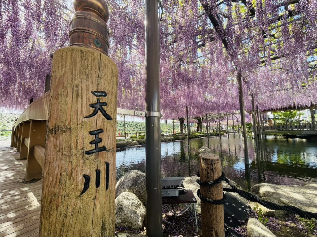 藤棚で有名な天王川公園へ。ちょうど藤まつりを開催中で、駐車場は池の周りを囲うように円を描いている。藤棚までは少し歩くらしいけど、池の真ん中にある庭園島に少量の藤棚を発見。これはこれで立派なんですけどー。本格的な藤棚をみるため、鯉のおねだりを断り、透明の巨大屋根とスタバが支配する広場を抜け、謎のトンネルを抜け、到着。ここが藤まつりの本部か。いやはやとんでもないことになってる!あたり一面紫の世界!完全に◯滅の刃・最終選別の地です。池にたまる藤の花、橋と藤の花、幹と藤の花、灯籠と藤の花。紫ワールド、存分に堪能させていただきました。